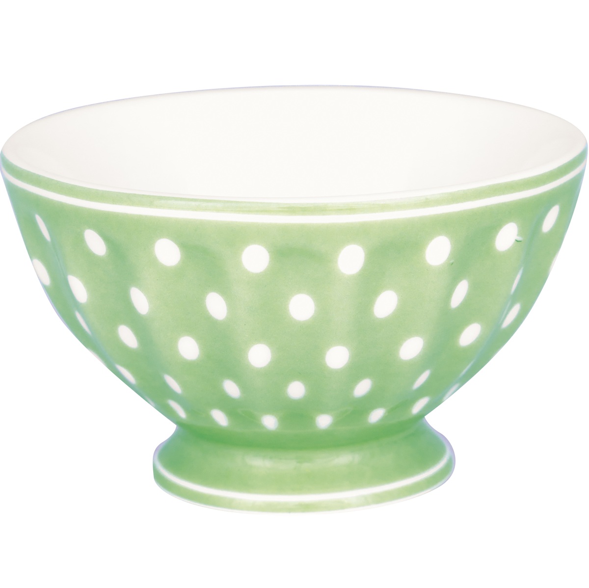 Miseczka francuska Dotty Green Green Gate to uroczy dodatek do codziennych rytuałów przy stole. Pastelowo-zielone tło ozdobione drobnymi białymi kropeczkami nadaje jej sielski, skandynawski charakter, który pięknie wpisuje się w styl cottage i vintage.