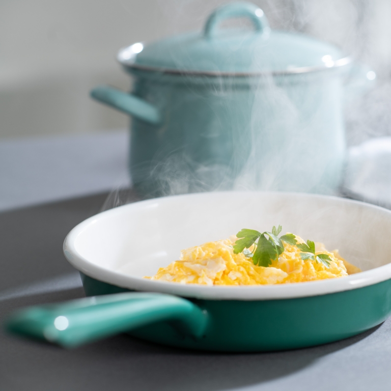 Użytkowanie: Aby uzyskać najlepsze rezultaty, używaj niewielkiej ilości masła lub oleju, unikając zbyt wysokiej temperatury.Patelni emaliowanej nie nagrzewamy zbyt mocno(na indukcji wystarczy 4) by uniknąć przypalenia,przywierania.Stalowy rdzeń bardzo szybko przewodzi ciepło,dlatego wystarczy podgrzewać patelnię razem z potrawą. Sprawdź temperaturę patelni poprzez umieszczenie kropli mieszanki jajecznej na dnie – jeśli zacznie się skurczać, patelnia jest zbyt gorąca. Idealna temperatura to moment, gdy kropla zaczyna lekko zasychać. Wlej całą mieszankę jajeczną, zmniejsz ogień i poczekaj, aż omlet łatwo oddzieli się od patelni. Dopiero wtedy możesz go odwrócić.