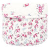 Wykonany z wysokiej jakości bawełny, koszyczek zachwyca swoim wyjątkowym wzornictwem i funkcjonalnością. Wierzch koszyczka ozdobiony jest ślicznymi kwiatkami na białym tle, dodając mu delikatności i elegancji. Natomiast wnętrze koszyczka wykonane jest z materiału w drobne kwiatuszki, które dodają mu uroku i klasy. Dodatkowym elementem ozdobnym jest wywinięty kołnierz z wewnętrznego materiału, który dodaje koszyczkowi dodatkowego uroku i stylu. Koszyczka jest usztywniony, a dół koszyczka jest dodatkowo pikowany ,co sprawia, że może być używany do różnych celów. Doskonale sprawdzi się jako pojemnik do przechowywania drobiazgów, podawania chleba, osłona dla doniczki lub do innych praktycznych zastosowań.