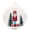 Szklana bombka o średnicy 10 cm, wykonana z przezroczystego szkła. Na zewnątrz bombki znajdują się białe płatki śniegu, a wewnątrz stoi urocza balerina w biało-czerwonej kreacji ze złotymi skrzydełkami, ustawiona na pyłku śnieżnym.
