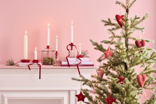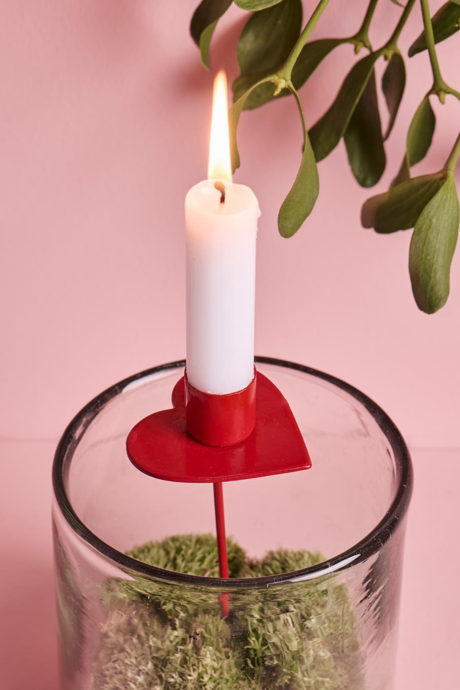 Czerwony metalowy świecznik‑włócznia z serduszkiem — kolekcja Stillenat, IB Laursen.