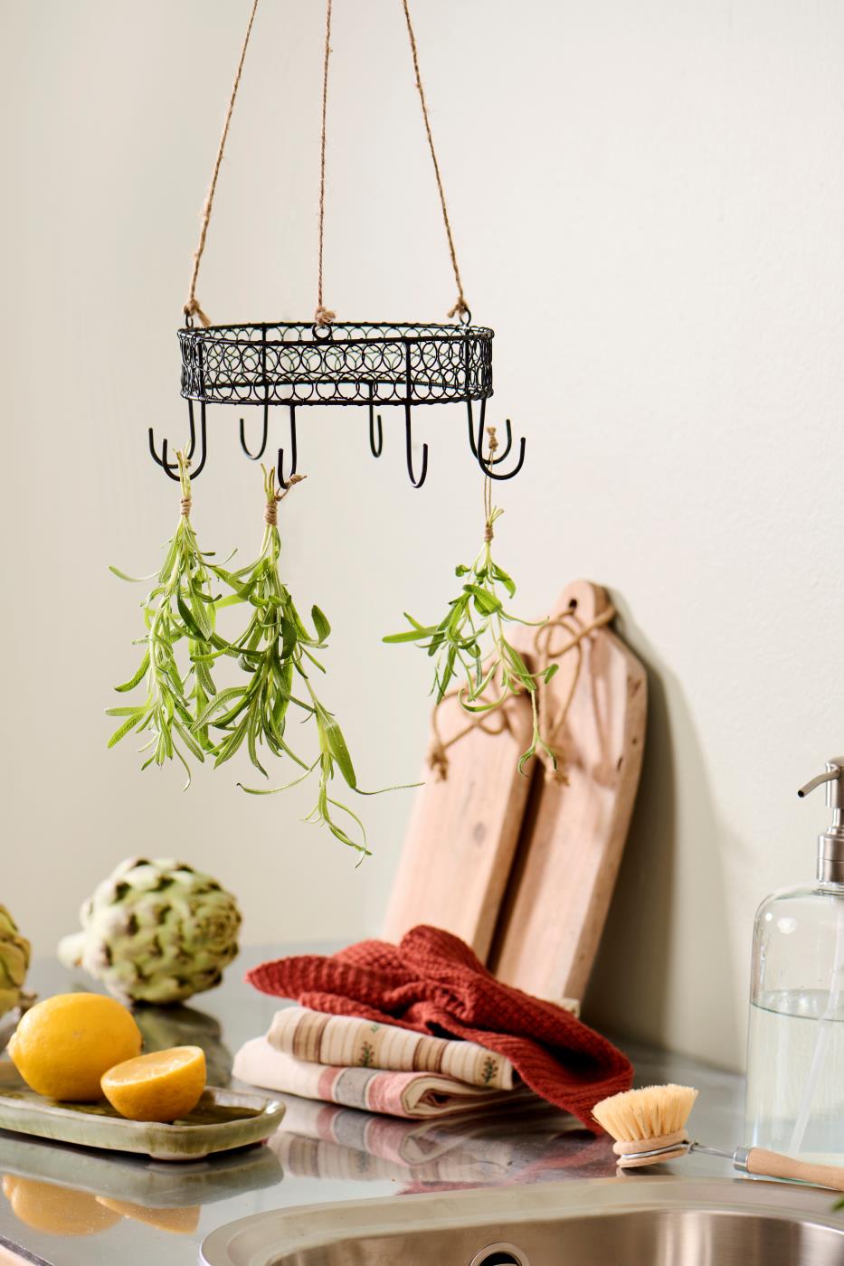 Stwórz praktyczną i efektowną dekorację w swoim wnętrzu z pomocą tej wiszącej obręczy z 8 haczykami marki ib Laursen. Ta lekka, okrągła konstrukcja na sznurku jutowym to idealne połączenie funkcji użytkowej i dekoracji — możesz powiesić ją nad wyspą kuchenną, nad stołem albo nad parapetem, a każdy haczyk stanie się miejscem na ozdoby, zioła, rękawice kuchenne i wiele innych drobiazgów.