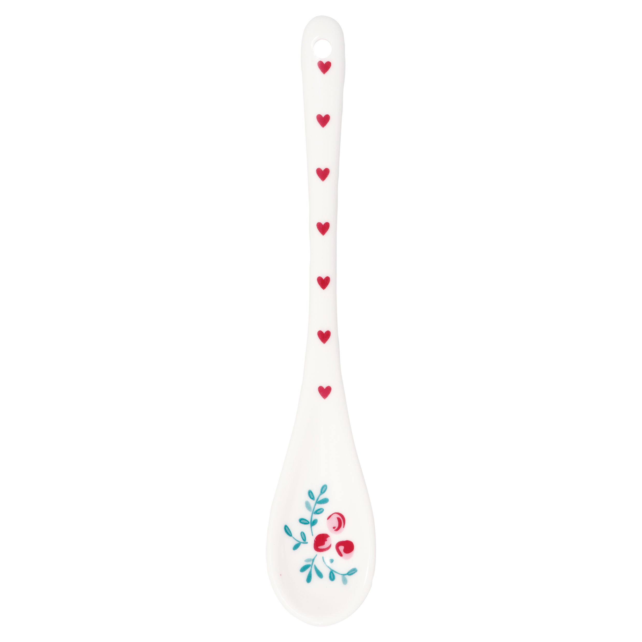 Porcelanowa łyżeczka z kolekcji Belia White marki Green Gate. Piękna łyżeczka ozdobiona czerwonymi serduszkami na białym tle.