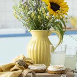 Dzbanek wykonany z kamionki,w przyjemnym, pastelowym odcieniu żółci.Doskonale sprawdza się jako wazon na kwiaty.Pięknie wygląda w kompozycji z polnymi kwiatami lub słonecznikami.